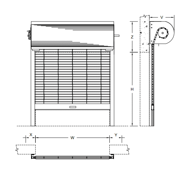 • Steel pipe houses torsion spring assembly and supports curtain with a maximum deflection of .03 inch per foot of width. Torsion springs are mounted on a continuous cold rolled steel shaft, adjustable by a tension wheel outside or inside one bracket.