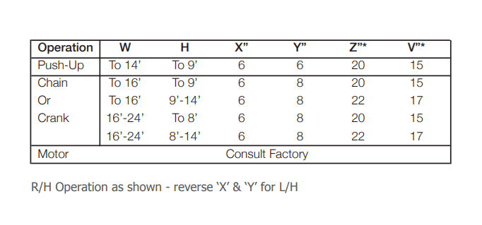 • Push-up to 14′ wide and 9′ high and chain hoist on larger sizes is standard. Awning crank, crank box or motor operation are optional.