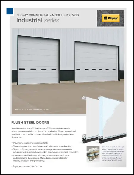 Clopay Industrial Series overhead doors provide a combination of performance and reliability for a range of industrial applications. For increased energy efficiency, polystyrene insulated insulation with a vinyl or steel backer, is available. These commercial doors offer an assortment of flush, ribbed or raised panel designs in a variety of colors, textures, windows and steel gauges. Ideal applications include warehouses, loading docks and industrial and agricultural facilities.
